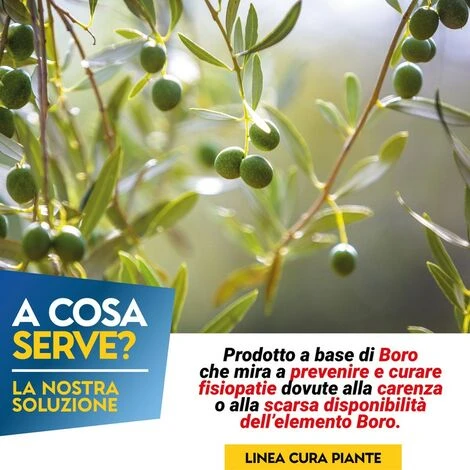 È un preparato specifico il cui impiego mira a prevenire e curare quelle fisiopatie connesse alla carenza o alla scarsità dell’elemento Boro. Tale oligoelemento esercita sui vegetali una complessa azione catalitica dei processi ossidativi: partecipa alla respirazione e alla fotosintesi; regola il metabolismo auxinico. E’ dimostrato come: favorisca la fertilità delle gemme e l’allegagione; innalzi la soglia di resistenza al freddo; provochi un anticipo della maturazione. Appropriate applicazioni di boro complex contribuiscono all’incremento quali-quantitativo della produzione.