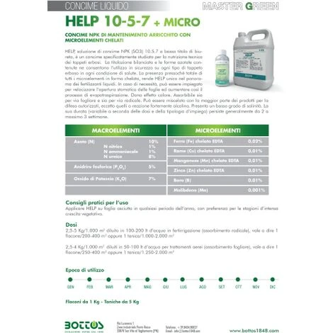 HELP, soluzione di concime NPK (SO3) 10.5.7 a basso titolo di biureto, e’ un concime specificatamente studiato per la nutrizione tecnica