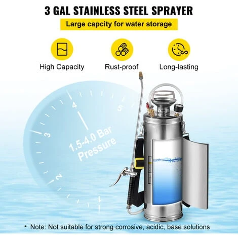 Questo spruzzatore a pompa manuale è realizzato in resistente materiale in acciaio inossidabile, resistente alla ruggine per un uso a lungo termine. E la capacità di 3 galloni è abbastanza grande per soddisfare le tue esigenze.